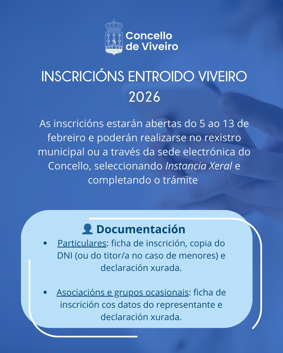 O prazo de inscrición estará aberto do 5 ao 13 de febreiro de 2026, podendo realizarse tanto no rexistro municipal como a través da sede electrónica do Concello de Viveiro, achegando a documentación requirida segundo o tipo de participante.